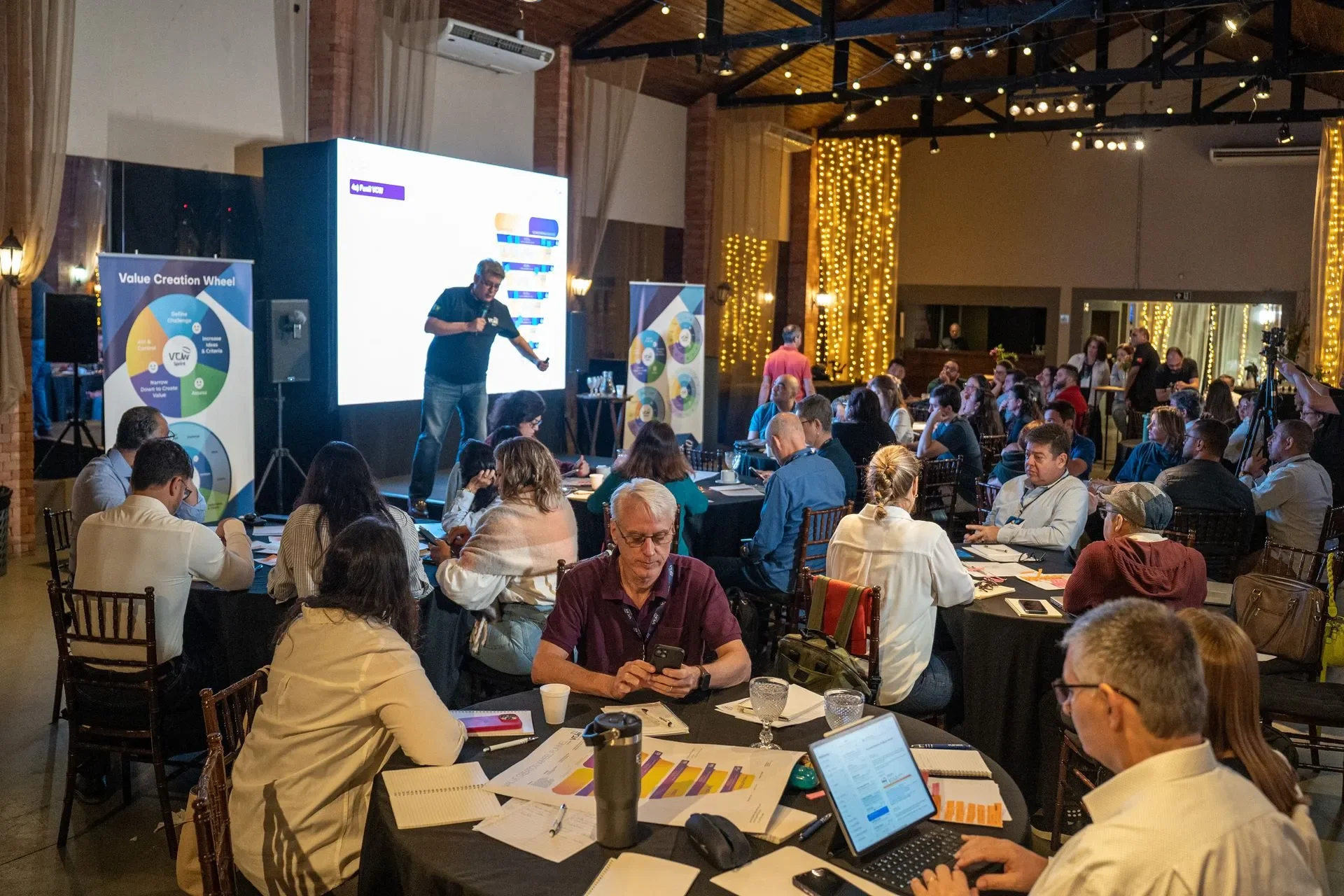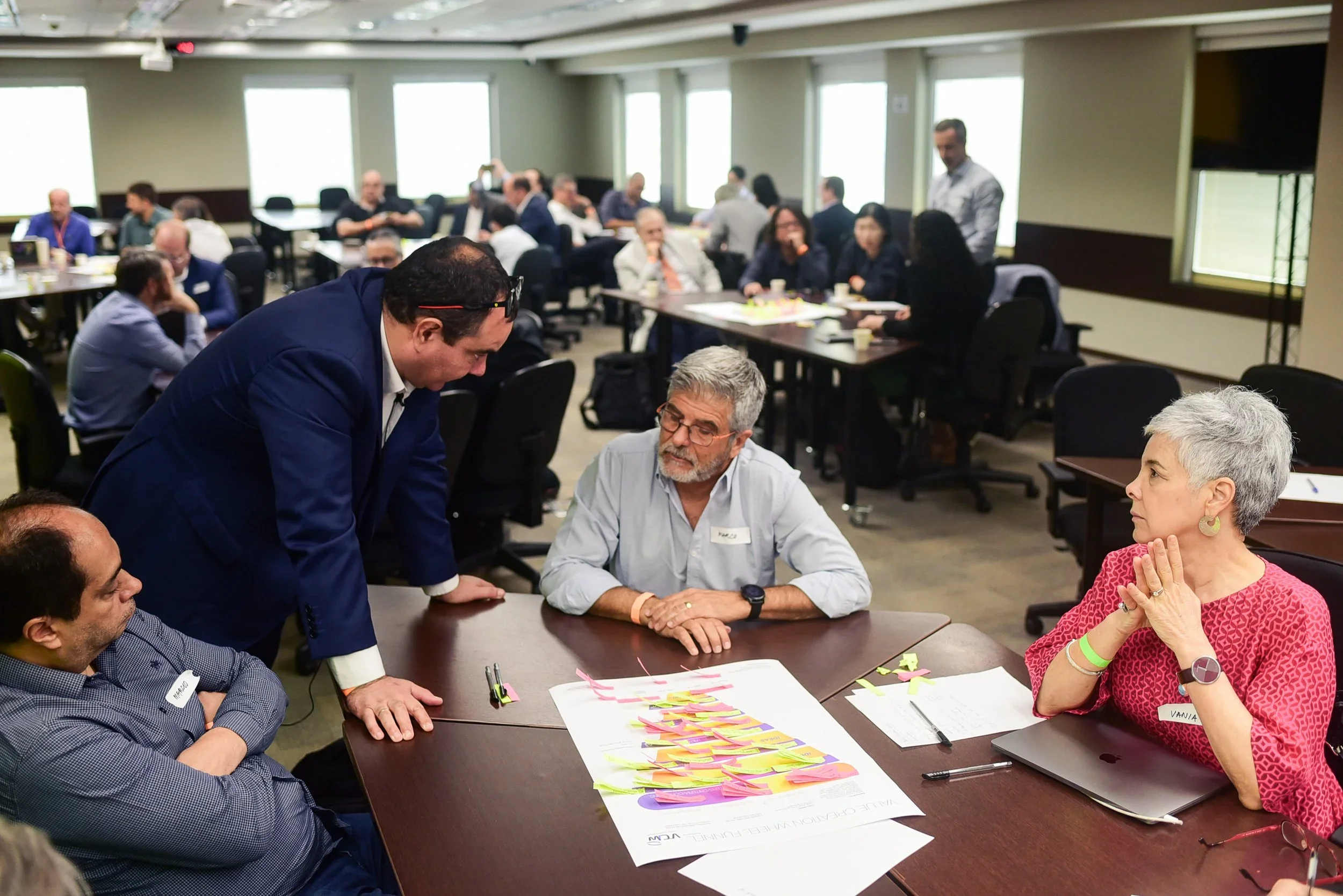 Diversos participantes (equipe VCW®, stakeholders, KDMs) geram livremente ideias e critérios para solucionar o desafio, sem julgamento.